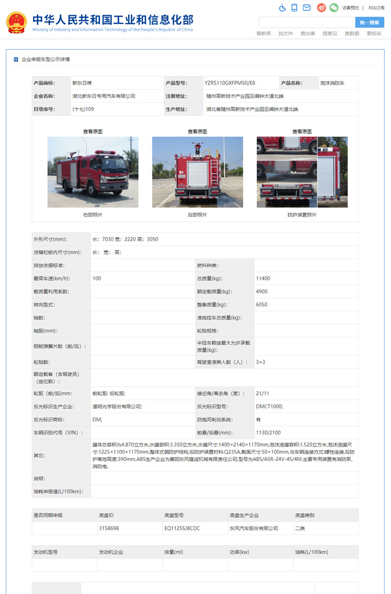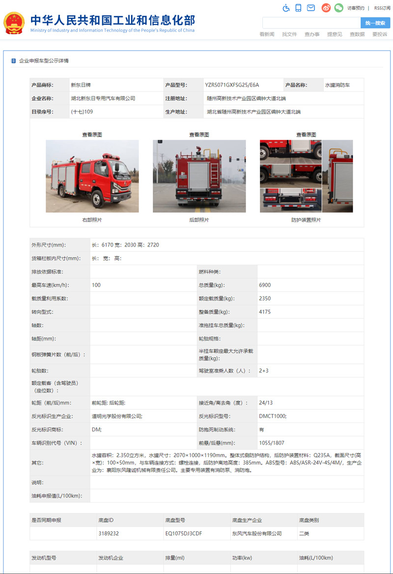 根據(jù)《道路機動車輛生產(chǎn)企業(yè)及產(chǎn)品公告》管理和《財政部 稅務(wù)總局 工業(yè)和信息化部 交通運輸部關(guān)于節(jié)能 新能源車船享受車船稅優(yōu)惠政策的通知》(財稅〔2018〕74號)的有關(guān)要求,現(xiàn)將《道路機動車輛生產(chǎn)企業(yè)及產(chǎn)品公告》(第343批)中可以看到,我公司有兩款消防車公告公示,東風(fēng)2.5噸水罐消防車和東風(fēng)5噸泡沫消防車。