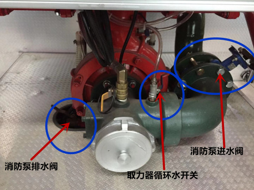 關(guān)閉消防泵進水閥,打開消防泵排水閥,關(guān)閉取力器循環(huán)水開關(guān)